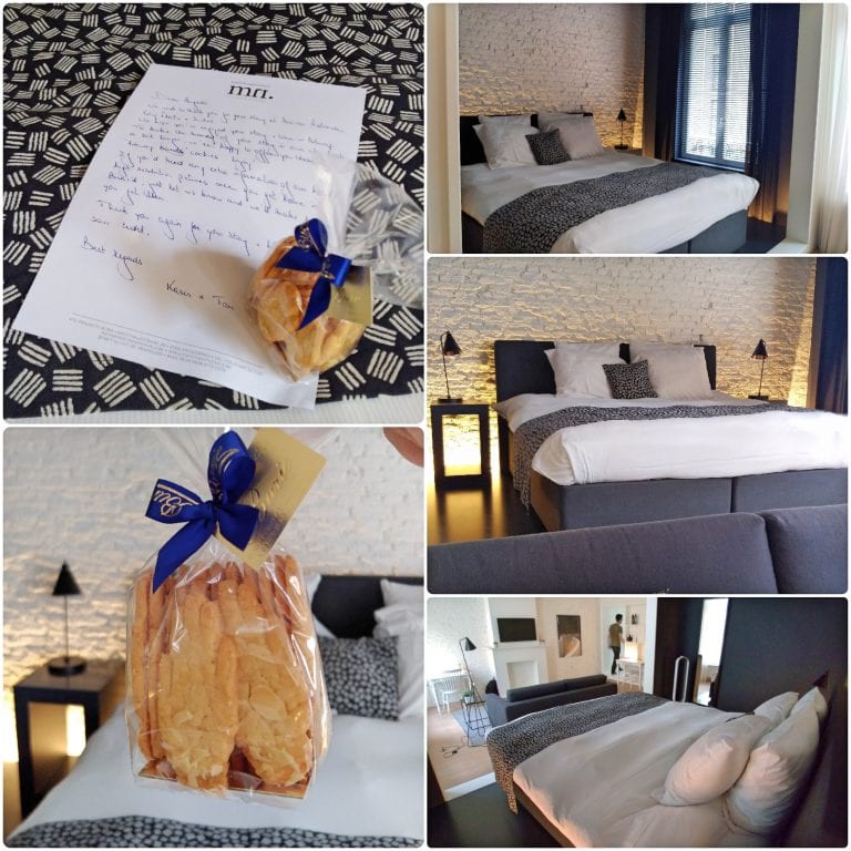 Ficamos na Deluxe Suite que é enorme (54 m²) e tem vista para um elegante edifício que remonta a 1894 e também para a torre histórica da igreja gótica Sint-Andries (século XVI). Essa suíte conta com uma cama king-size enorme e com roupa de cama fofinha e cheirosa, daquelas que dá vontade de se atirar e não sair mais. Ainda tinha um mimo esperando a gente: biscoitinhos tradicionais da Antuérpia, em formato de mão! Delícia de recepção, não?! 🙂