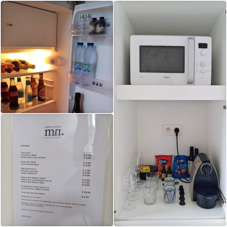 Além do que já citamos, há outras comodidades oferecidas na suíte como o frigobar onde é possível encontrar água cortesia. Além disso, há snacks e bebidas como vinho, whisky, vodka, cerveja, refrigerante e sucos disponíveis com preços (até bem justos) fixados no cardápio do mini-bar. Uma dica inclusive recomendada no próprio site da Maison Nationale é a possibilidade de fazer compras no supermercado que fica em frente. Por isso eles ainda oferecem micro-ondas, chaleira elétrica e cafeteira Nespresso – com cápsulas cortesia. Maravilha, né?!