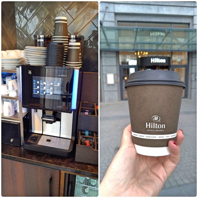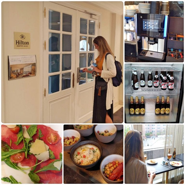 O hotel conta com wifi liberado nos quartos e áreas comuns tendo funcionando muito bem durante a nossa estadia. Para quem é associado Hilton Honors (ou optou por um quarto que dá direito ao benefício), o lounge vip pode ser acessado também no andar térreo do hotel. Aberto até as 20h, o local disponibiliza bebidas e comidinhas ao longo de todo o dia. O primeiro destaque é a geladeira com cervejas locais: Leffe, Hoegarden e Jupiter. <3 Entre as várias mini porções de comidas quentes e frias, experimentamos o Carpaccio e a Burrata (muito boa!) acompanhadas de pães. Ótima opção para quem quer economizar o lanche da tarde, é só dar uma passadinha no hotel e aproveitar. 🙂