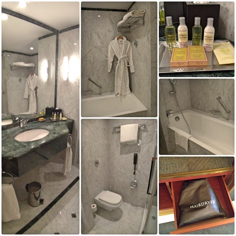 O banheiro segue o estilo clássico, com acabamento e pia em mármore. O nosso contava com banheira e chuveiro em estilo box separados. Roupão e secador de cabelos estão disponíveis, a disposição do hóspede. O kit de amenities é da linha de produtos de luxo ‘Crabtree & Evelyn – Verbena and Lavander’, e conta com sabonete líquido, loção hidratante, shampoo e condicionador.
