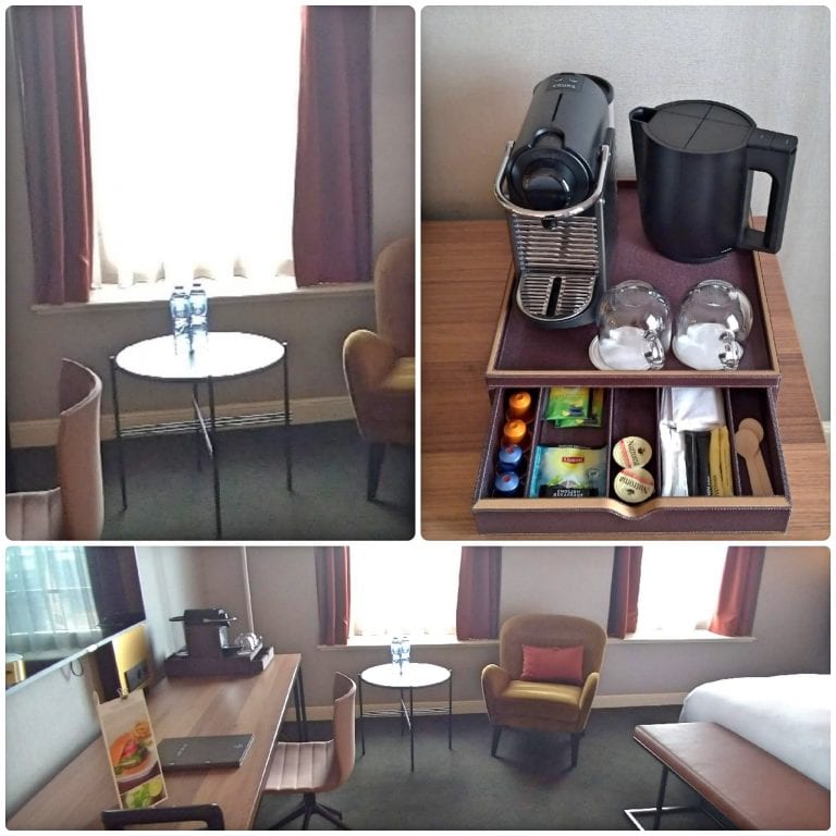 Além de contar com a estrutura básica para um hotel dessa categoria (ar condicionado, cofre, ferro com tábua de passar e geladeira) o Hilton Brussels Grand Place oferece ainda alguns mimos. Além de 2 garrafas de água mineral cortesia, havia Cafeteira Nespresso e chaleira elétrica com algumas cápsulas de café, sachês de chá Lipton e aqueles mini potinhos de leite comuns na Europa (que a gente adora).