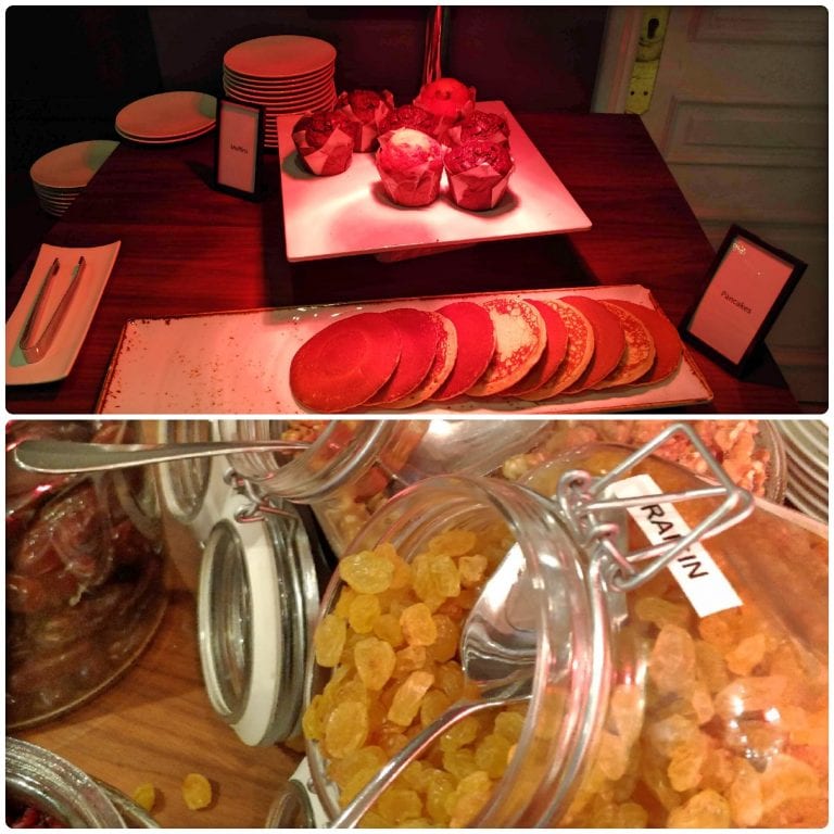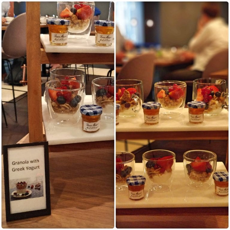 O salão do café da manhã fica no andar térreo do hotel, pouco depois do hall com os elevadores. Logo na entrada, é oferecido algum item especial em destaque – durante a nossa estadia, havia potinhos de iogurte grego com frutas vermelhas frescas e granola, acompanhado de mini potinhos de mel.