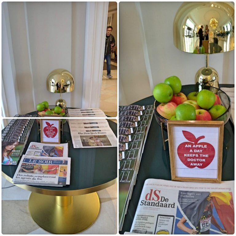 Ainda no salão principal, uma oferta simpática – e bem saudável – para aplacar a fome dos hóspedes recém-chegados: maçãs. As frutas ficam disponíveis ao longo de todo o dia em uma mesa onde são oferecidos jornais do dia e uma seleção de revistas com assuntos sobre viagem e opções de luxo.