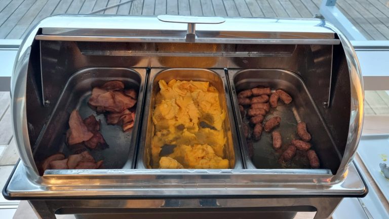 O rechaud de comidinhas quentes traz os já tradicionais bacon, ovos mexidos e linguiças.