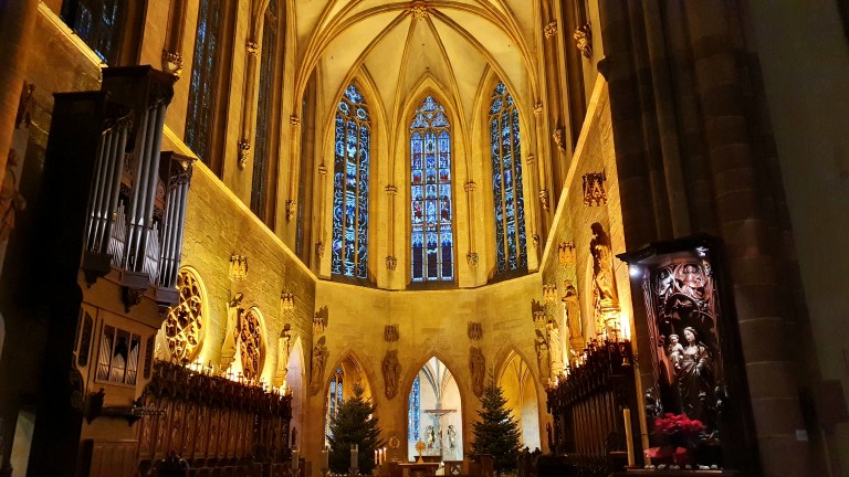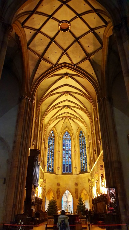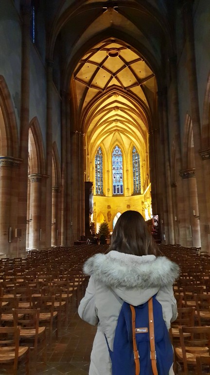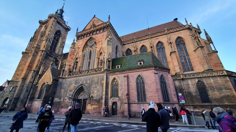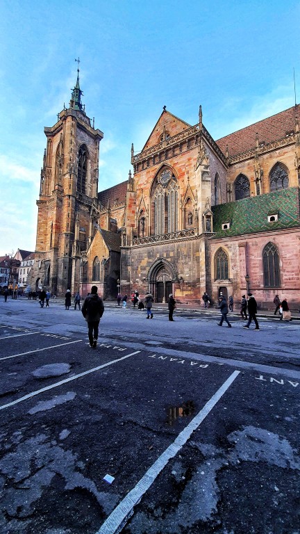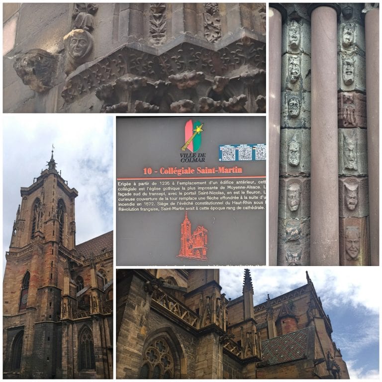 Mais adiante está a Place de la Cathedrale, que tem esse nome por abrigar a outra Igreja famosa da cidade, a Collégiale Saint-Martin de Colmar ou ” Catedral de São Martinho de Colmar“. Construída entre 1235 e 1365, a igreja colegiada de Saint-Martin é uma obra importante da arquitetura gótica na Alsácia. Chama atenção pelos telhados coloridos e brilhantes característicos de outra região francesa, a Borgonha, e pela ornamentação em seu exterior, especialmente ao redor das portas de entrada.
