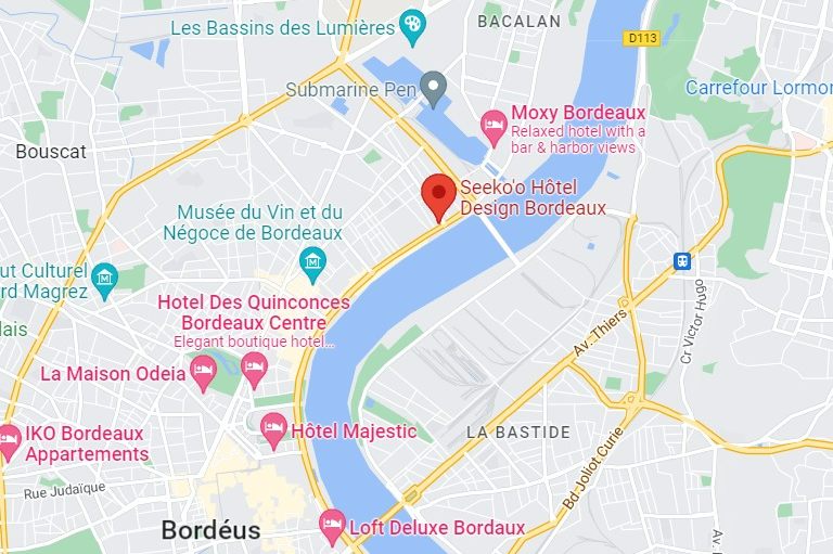 O Seeko’o Hotel Bordeaux é um hotel design 4 estrelas localizado no renovado bairro de Chartrons, na parte norte da cidade, a cerca de 10 minutos de transporte público em relação ao centro histórico e cerca de 15-20 minutos até a principal estação de trem de Bordeaux, a Gare Saint Jean. Além de ser uma localização bem servida de transporte público (a estação de tram-bonde fica praticamente em frente ao hotel) e ter boas opções de restaurantes e comércio nos arredores, a principal vantagem de se hospedar no bairro de Chartrons e no Seeko’o Hotel Bordeaux em especial é a proximidade em relação a La Cité du Vin. A “Cidade do Vinho” é uma verdadeira Disneylândia para os amantes dos vinhos em Bordeaux, e fica a poucos metros de caminhada a partir do Seeko’o Hotel.