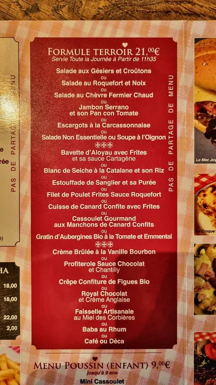Endereço: 2 Pl. Marcou, 11000, cidadela murada de Carcassonne, França. Aberto todos os dias, com serviço de café da manhã a partir das 8h e pratos quentes para almoço ou jantar iniciando às 11h35 sem intervalos até às 23h.