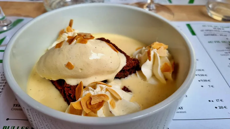 E para muitos de nós viajantes e exploradores de culinária, a melhor a parte: sobremesa! Ainda mais na França com toda sua fama em doces e sobremesas! Só digo uma coisa: esse Fondant Chocolat Crème Anglaise estava divino! Massinha fofa e quentinha de bolo de chocolate amargo numa piscina do mais perfeito creme inglês. Sem contar que tinha uma potoca de sorvete de baunilha (consegue ver os pontinhos pretos da baunilha?) e mais duas potocas de chantily. E tudo isso com amêndoas laminadas tostadas por cima! Salivei só de relembrar aqui enquanto escrevo.