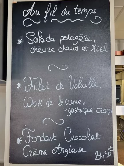 O menu do dia da Brasserie a 4 Temps tem até nome: Au Fil du Temps. Esse menu é uma excelente opção de experiência e os pratos variam todos os dias. Por esse motivo, certamente você não vai encontrar exatamente os pratos que nós provamos e estão apresentados abaixo. Contudo, como este é um mini guia de onde comer em Carcassonne, os pratos que nós experimentamos podem te dar uma boa ideia de como são servidos, quantidade e da proposta do restaurante.