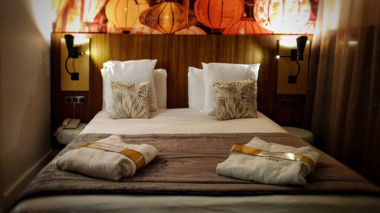 Ficamos em um quarto da categoria “Privilege Room”, uma categoria acima do quarto standard. Os quartos são de tamanho mediano, mas suficientes para a estadia de um casal. A decoração segue linhas orientais, com uma gravura de “balões japoneses” na cabeceira da cama – que era grande e bem confortável.