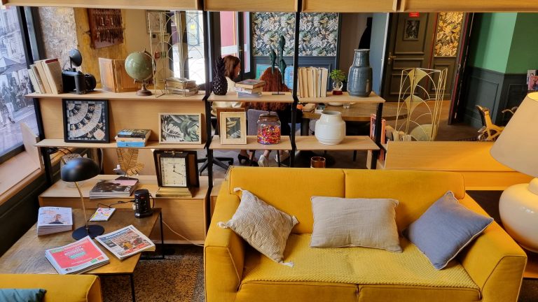 Algumas fotos do lobby do Royal Hôtel ajudam a ilustrar essas características, com uma mescla de objetos de decoração retrô com móveis de estilo moderno e tons vibrantes, com papéis de parede de estilo antigo e uma escadaria original preservada e renovada para manter essa atmosfera de charme que remete a uma outra época.