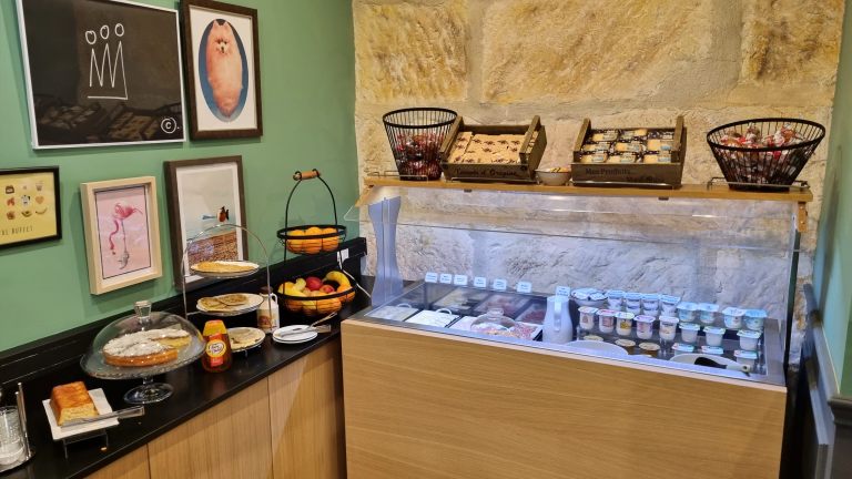 O café da manhã do Royal Hôtel é servido no andar térreo, em um espaço bem simpático anexo ao lobby/recepção. A depender do valor da diária e da categoria de quarto escolhida no momento da reserva, o serviço pode (ou não) estar incluído no valor total da estadia (todas as informações sobre valores e condições estão no final desse artigo).