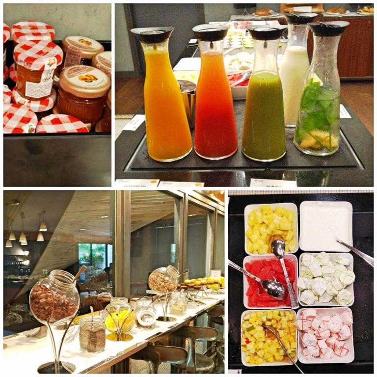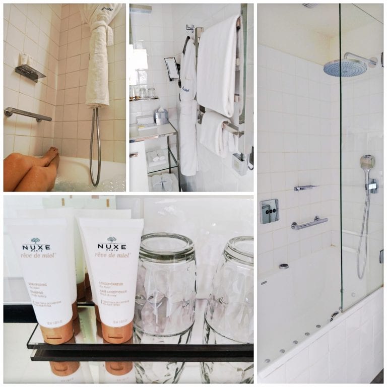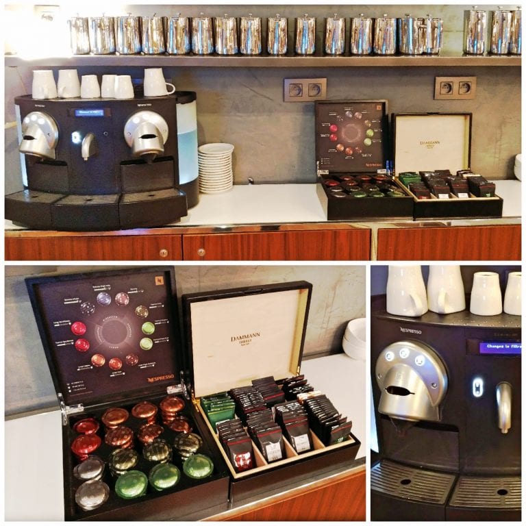 A estrutura oferecida é bem completa: TV de 55 polegadas, ar condicionado, minibar, utensílios para chá/café com máquina Nespresso e chaleira elétrica, com capsulas cortesia e chás da marca Dammann Frères. Havia ainda 2 garrafas de água grátis, o que é sempre uma iniciativa simpática dos hotéis. 🙂
