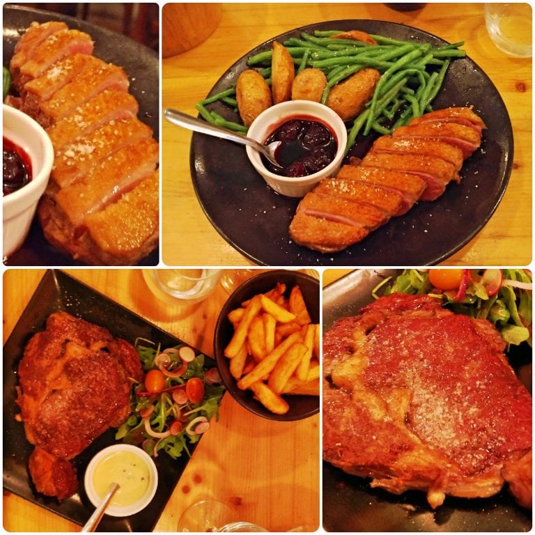 Já para os pratos principais, adivinha? Minha escolha foi novamente por pato. “Filet de canette, sauce cerise, haricots verts frais, pomme de terre grenailles rôties au thym” (18€), o que em português seria filé de pato, molho de cereja, vagem verde frita e batatinha rosti com tomilho. Adorei a combinação, que além de saborosa ainda era bem saudável 😉