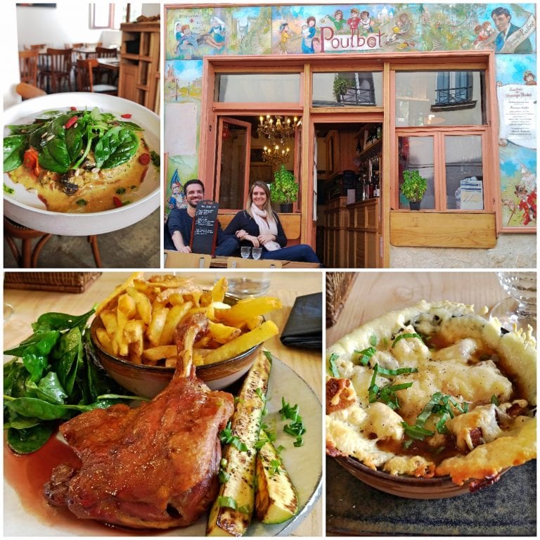 Pudemos experimentar a tradicional sopa de cebola gratinada que, por sinal, foi uma das melhores que já comemos – o queijinho gratinado é incrível. Vale destacar ainda o confit de canard (pato) com as melhores batatas fritas da vida! Com essa pegada gastronômica tradicional associada ao clima que a ilustração histórica de sua fachada representa, o Restaurant Le Poulbot tem uma atmosfera própria e ao mesmo tempo de um bistrô tipicamente parisiense. Um oásis em meio a tantas opções extremamente turísticas da região.