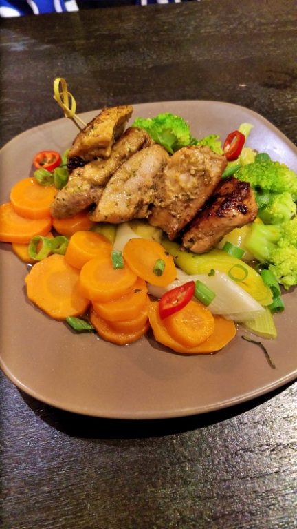 - Poulet – frango marinado na cerveja Brown Ale com alho poró cenoura e brócolis
