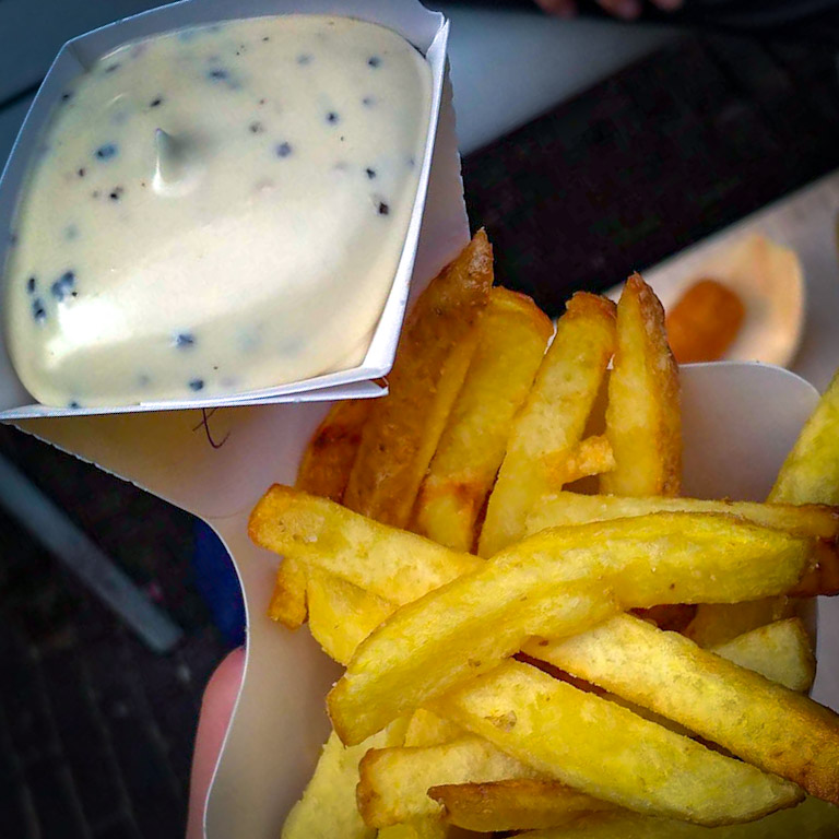 Experimente, por exemplo, o famoso Queijo Gouda e suas variações com diferentes sabores – com pimenta é o meu preferido. Outros clássicos que não podem faltar são os croquetes de peixe/camarão ou então as batatas fritas acompanhadas de maionese – nada mais típico do que isso!