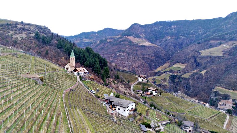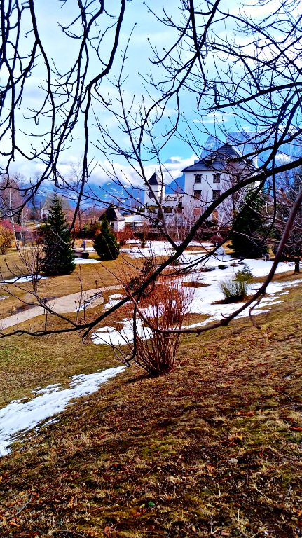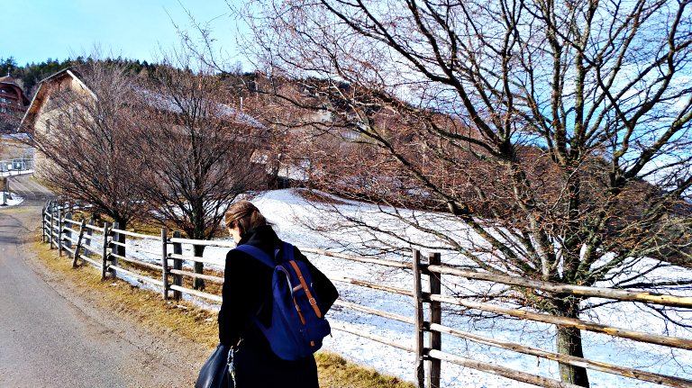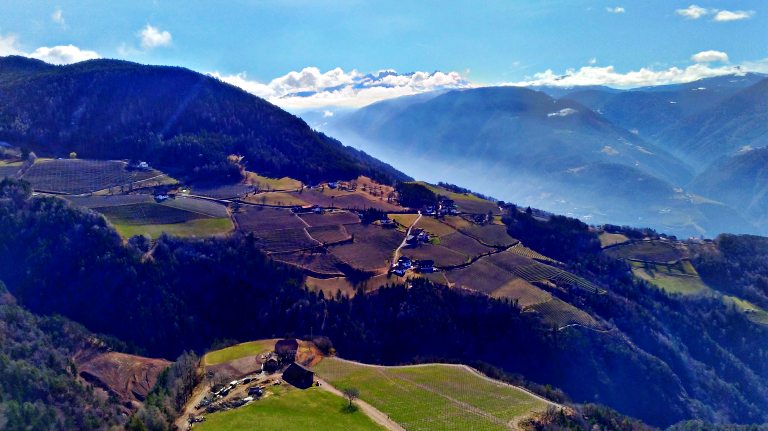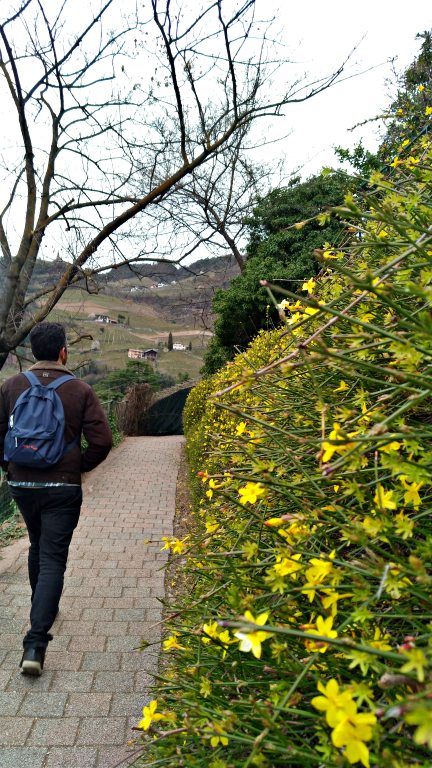 Durante a subida os picos nevados das cadeias de alpes despontam ao fundo, enquanto a paisagem é composta basicamente de casinhas em meio a vinhedos – que estavam secos por ser final de inverno. Mas ainda assim um belo visual!