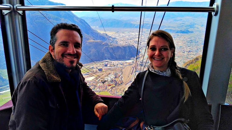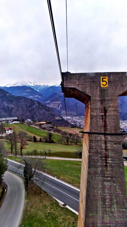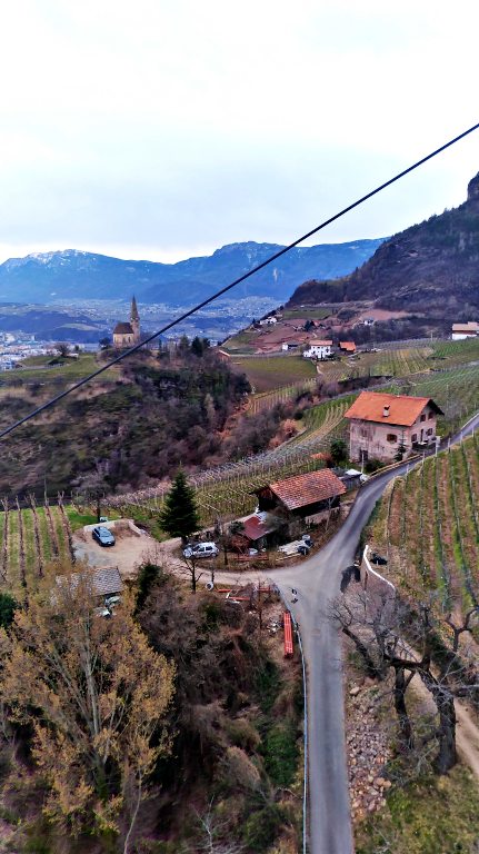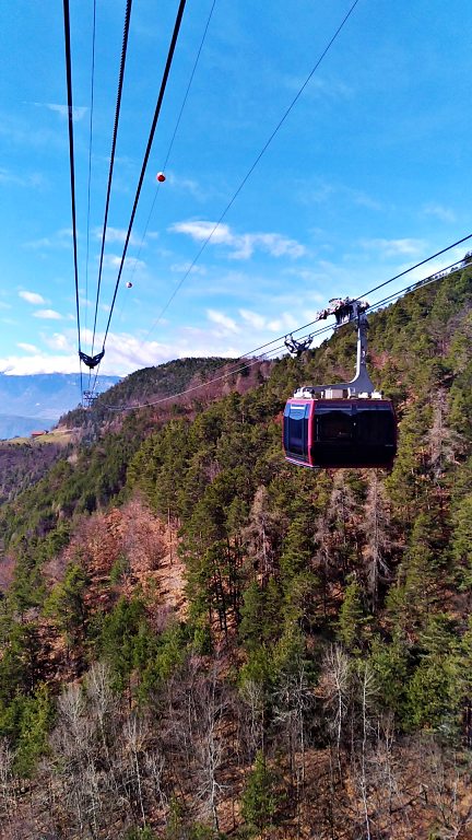 A primeira parte do passeio é realizada via teleférico entre Bolzano e Soprabolzano (Oberbozen) com duração de exatos 12 minutos. Pode parecer pouco tempo, mas acredito que tenha sido o teleférico de maior duração que já pegamos. E isso não é uma “reclamação” – muito pelo contrário, afinal o cenário é de fato impressionante. Chegamos a comentar entre nós que se o passeio fosse “só isso” (ir e voltar de teleférico sobrevoando as lindas planícies da região) a atividade já teria valido a pena.