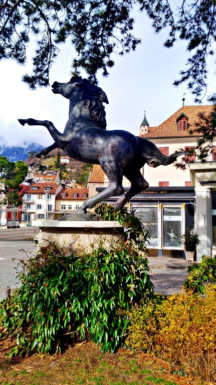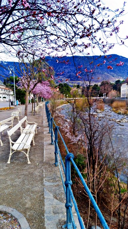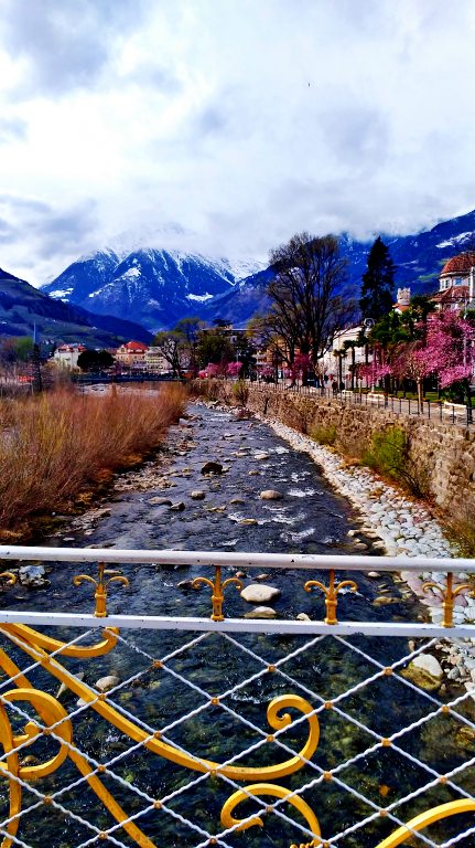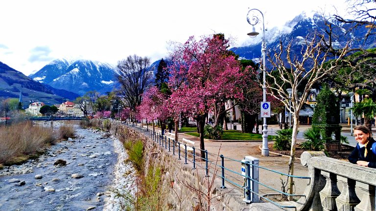 Já de volta a Bolzano, uma boa sugestão para aproveitar o período da tarde é um bate-volta de trem até a cidade de Merano, ainda mais ao norte, quase na fronteira com a Áustria. O trajeto de trem entre as duas cidades tem duração de 40 minutos – tempo que mal sentimos passar por conta das belas paisagens de colinas com cultivos de uvas e as montanhas das Dolomitas.