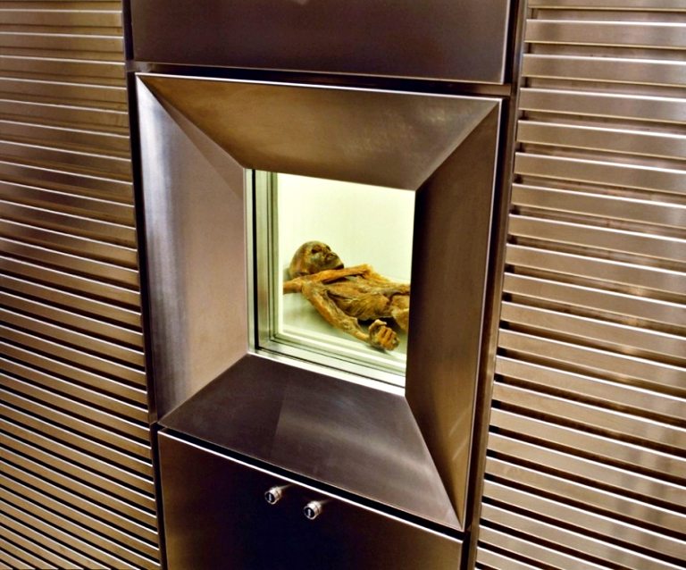 Mas afinal quem é Ötzi, o Iceman (homem de gelo)? Ötzi é uma múmia original com mais de 5300 anos que foi encontrada preservada pelo gelo em território pertencente a Bolzano – e por isso está exposta em um museu da cidade. Vale dizer que foi um processo de mumificação natural, e não artificial como os utilizados para preservar as múmias egípcias. Para conservá-la nas condições ideais, existe todo um aparato tecnológico e também de segurança que garante a sua preservação.