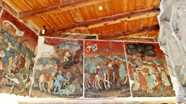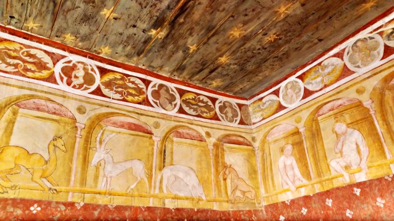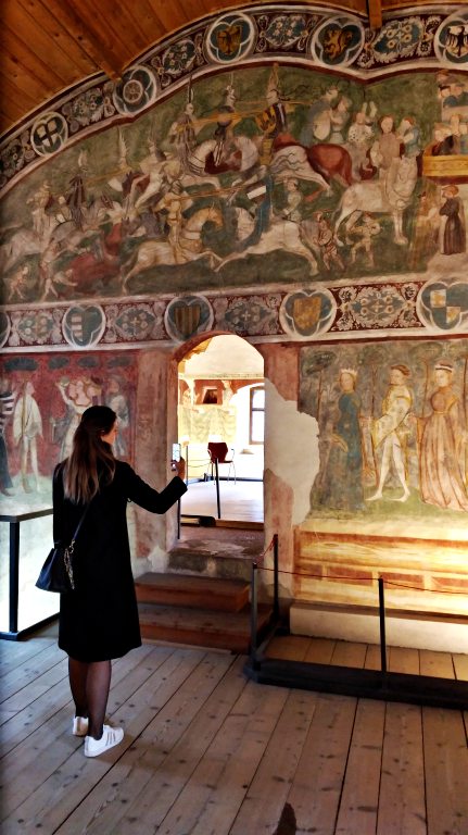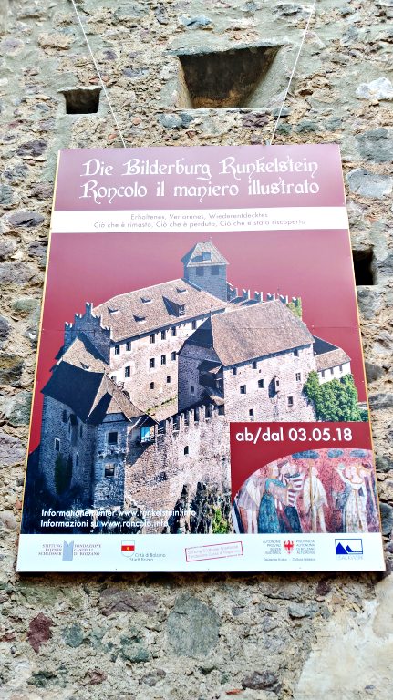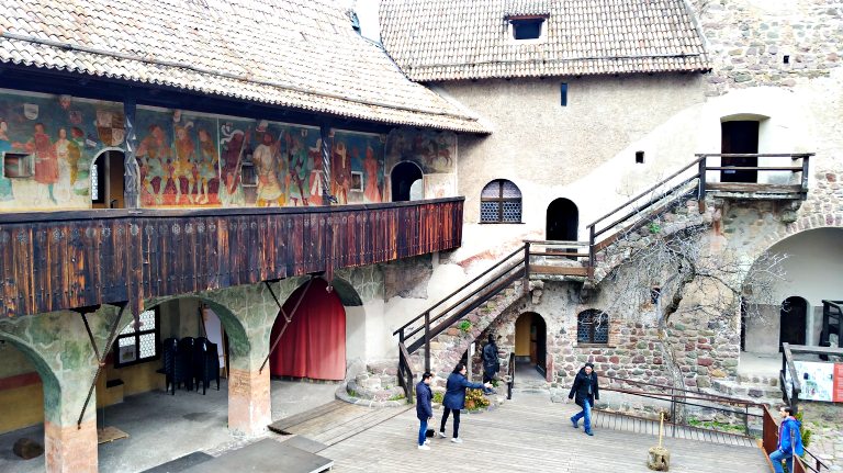 O destaque fica por conta da imensa quantidade de afrescos em praticamente todas as paredes internas e até em uma das paredes externas. Diferentemente da temática religiosa que normalmente é dominante nesse estilo, no Castel Roncolo os afrescos são de caráter profano e representam histórias populares e medievais, como a fábula do “Rei Arthur e os cavaleiros da Távola redonda”. Na verdade, este é o maior e mais bem preservado conjunto de afrescos profanos da Idade Média em todo o mundo!