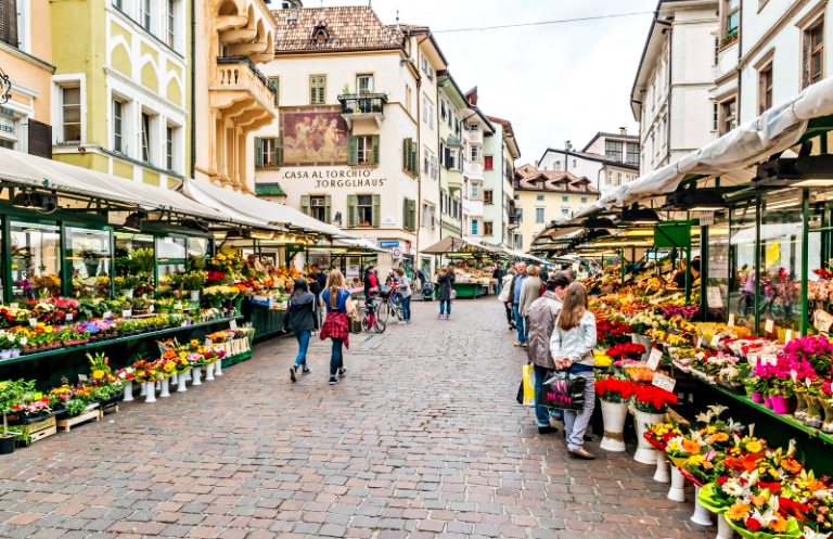 Mais uma parada imperdível no centro histórico de Bolzano é a animada Piazza delle Erbe, onde desde 1295 acontece diariamente um famoso mercado de frutas e vegetais (exceto sábados à tarde, domingos e feriados). Durante todo o dia as barracas coloridas atraem tanto turistas quanto moradores da cidade em busca de produtos frescos da região. Muitas das lojas no entorno da praça também são especializadas em produtos da gastronomia local, como frios, queijos e outras iguarias.
