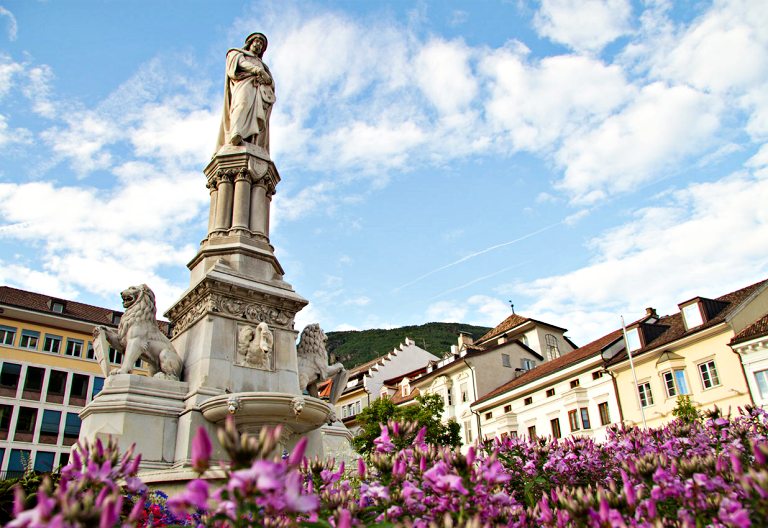 Um bom ponto para iniciar a caminhada pelo centro histórico é a Piazza Walther (Waltherplatz), uma praça importante que fica relativamente próxima à estação de trem, em uma localização bem central de Bolzano. Construída em 1808, a praça só recebeu o nome atual em 1901, em homenagem ao poeta alemão Walther von der Vogelweide (1170-1230) – que inclusive está representado na estátua de mármore no centro da Piazza.