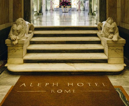 O Aleph Rome Hotel funciona em um antigo palácio histórico de Roma – a primeira sede do banco central da Itália. A imponência do local se apresenta a partir da fachada e se confirma na opulência de seu interior. O lobby amplo e muito claro combina o clássico com o moderno, em uma atmosfera de bastante luxo.