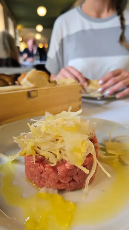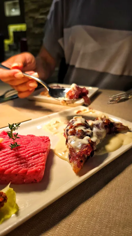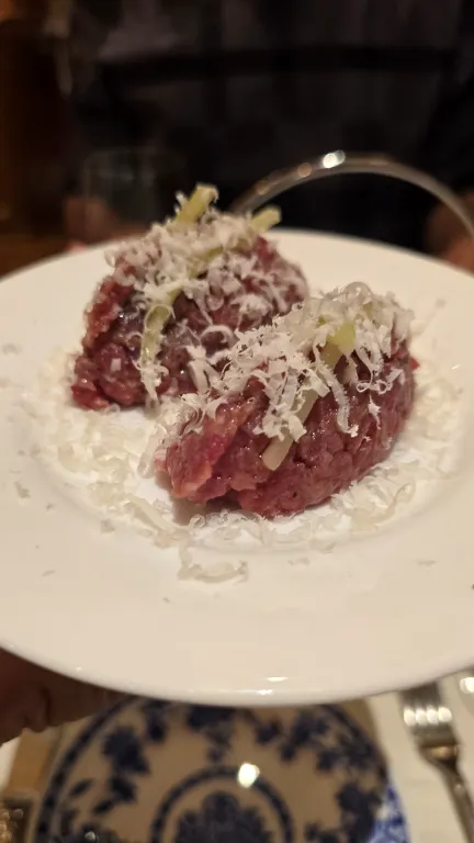 - Carne cruda: tartare de Fassona piemontesa, servido fresco, com tempero bem delicado e lascas de queijo.