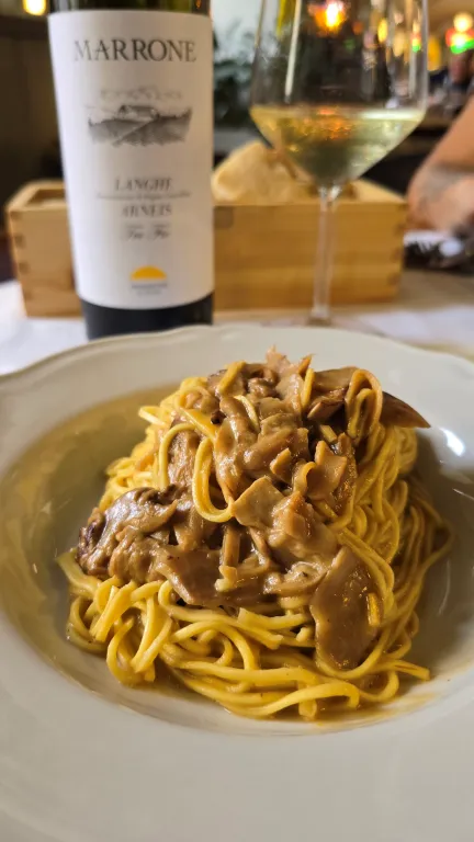 - Tajarin di nostra produzione ai funghi porcini della Val Varaita: massa longa e fresca produzida na casa, típica do Piemonte, servida com um ragu cremoso de cogumelos