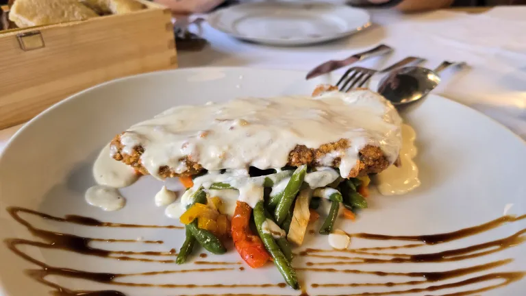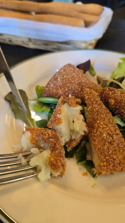 Se ainda sobrar espaço para experimentar um prato de carne, a pedida clássica da casa é o LA TORINESE DEL SAN GIORS Grissinopoli — uma típica cotoletta de vitela empanada com grissinis (aqueles tradicionais palitos de pão piemonteses) triturados com avelãs IGP do Piemonte. A carne vem servida com legumes salteados e uma fonduta de Toma del Lait Brusc, um queijo típico da região. Pedimos um para dividir após as massas. Um prato bem cremoso e de sabor marcante.