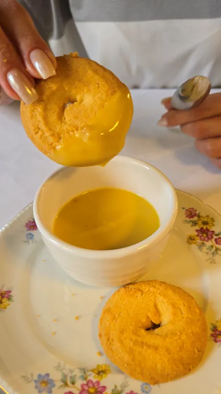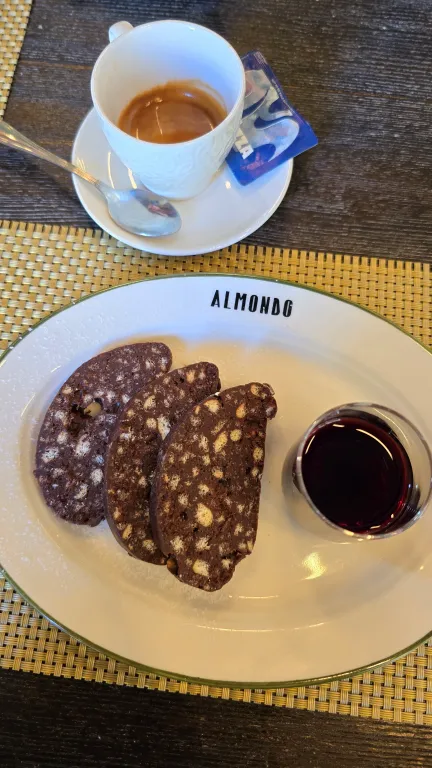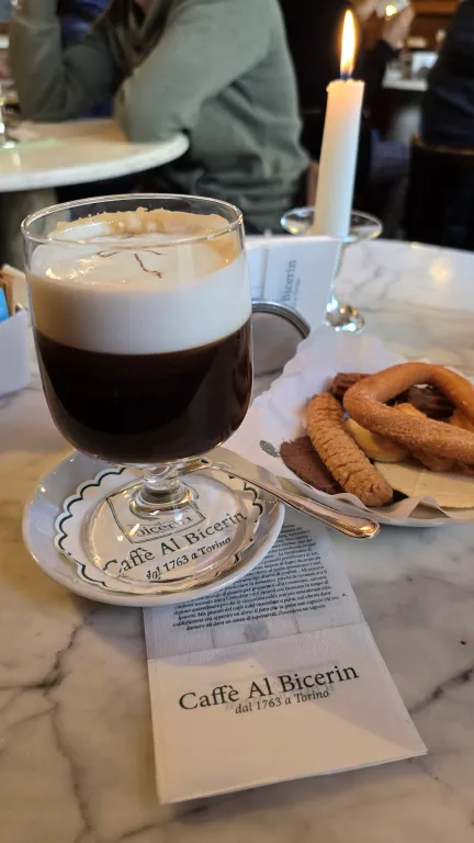 A bebida vem acompanhada de um pratinho com biscotti piemontesi — biscoitos secos tradicionais para mergulhar ou beliscar entre goles. Uma combinação perfeita para as manhãs frias de Turim.