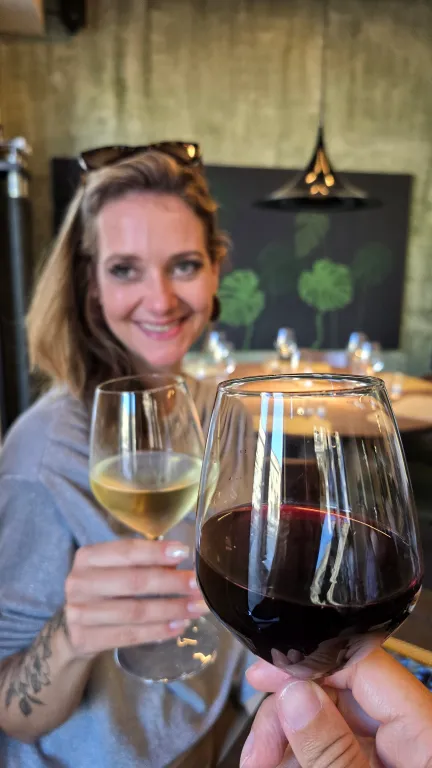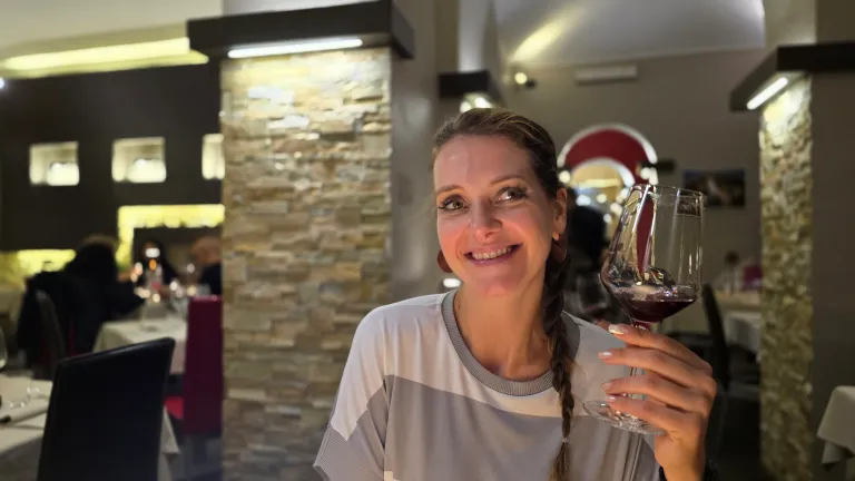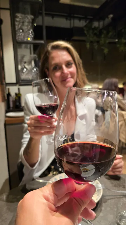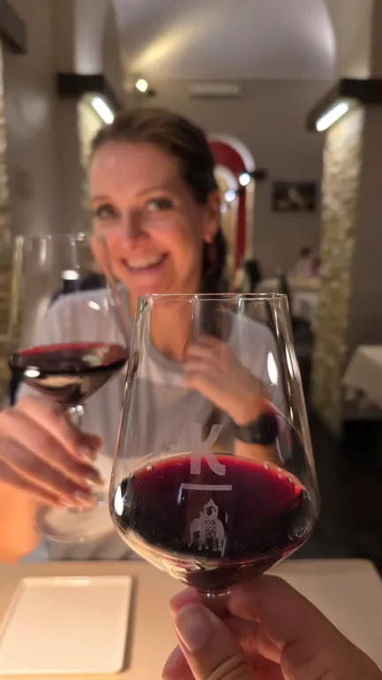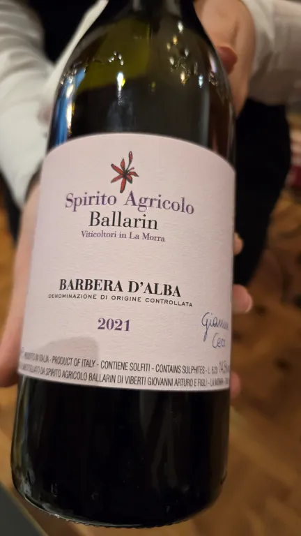 Para harmonizar com as entradas e pratos, escolhemos uma taça do vinho tinto local Barbera d’Alba Spirito Agricolo Ballarin 2021, sempre uma boa pedida.