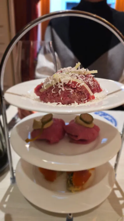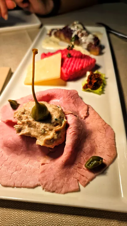 Entre as opções do menu de antipasti, a melhor sugestão é começar com um trio de nome sugestivo, o TOUR A PALAZZO MADAMA, que traz uma seleção de entradas piemontesas clássicas servidas em três andares: