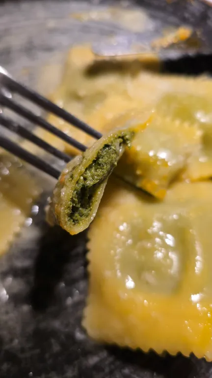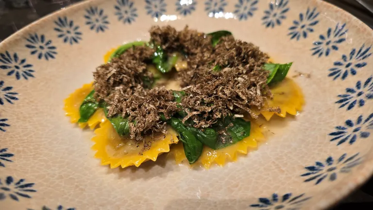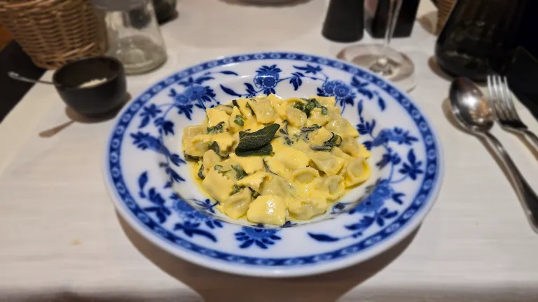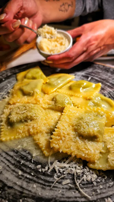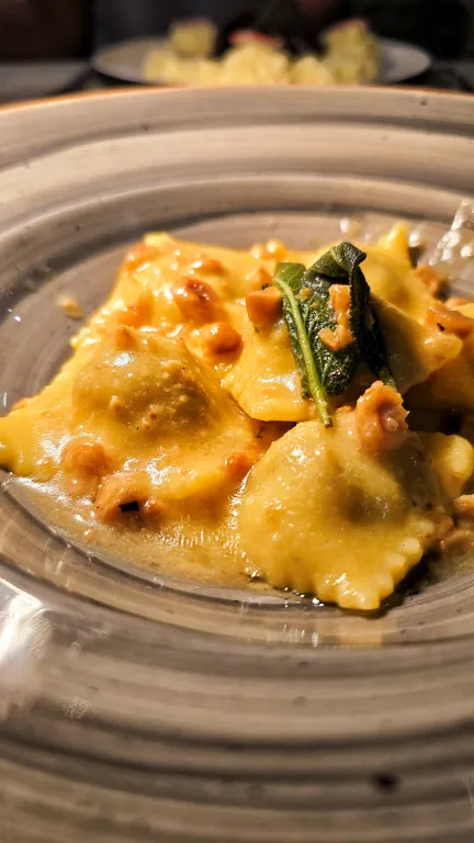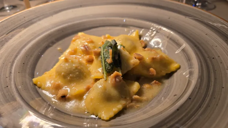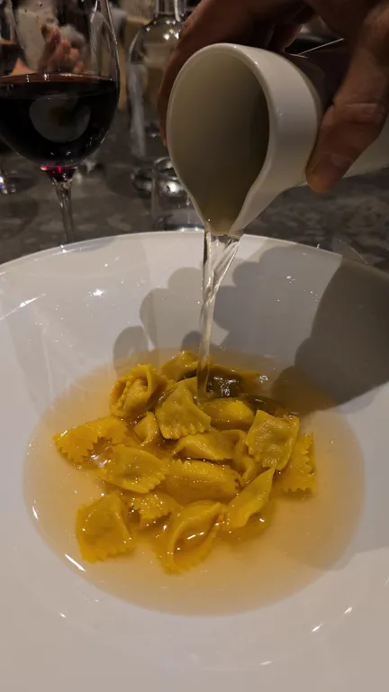 - Agnolotti gobbi di nostra produzione al ragù bianco di vitello di Razza Piemontese: massa recheada de produção própria, servidos com um ragu branco (sem tomate) feito com carne de vitelo da raça Piemontese.