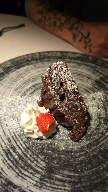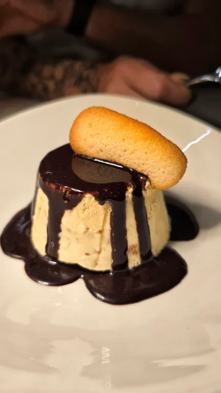 De sobremesa, pedimos o Semifreddo al torrone delle Langhe con salsa al cioccolato, uma opção típica da região que combina uma espécie de sorvete de torrone de amêndoas com calda quente de chocolate. Apesar de tradicional, foi o ponto menos interessante do jantar: a textura lembrava um sorvete comum e o sabor poderia ter sido mais marcante ou característico.