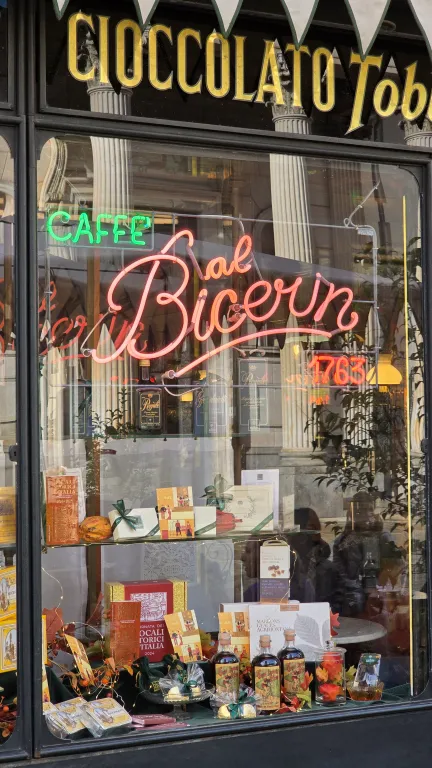 Fundado em 1763, o Al Bicerin é um dos cafés mais antigos e icônicos de Turim. Um verdadeiro pedacinho de história preservado diante da bela Chiesa della Consolata, em uma pracinha charmosa de paralelepípedos, com mesinhas ao ar livre muito disputadas nos dias de sol. A fachada é clássica, com vitrines antigas, letreiro de época e um grande “dal 1763” que não deixa dúvida sobre a tradição do lugar. O Al Bicerin é mais do que um café: uma verdadeira instituição de Turim.