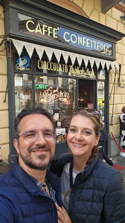 Além do Bicerin clássico, o local oferece outras opções do cardápio, como chocolate quente puro servido bem espesso, cappuccinos fumegantes ou chás em bule de porcelana. Para quem quer algo mais substancial, o Al Bicerin também dispõe de uma seleção de doces e tortas caseiras do dia, pães, brioches e até alguns salgados leves — tornando fácil montar um café da manhã completo ou mesmo um lanche de tarde sem pressa. Mas no nosso caso, um bicerin para cada um acompanhado de biscoitos foi mais do que suficiente para aproveitar a experiência e retomar as energias para seguir o roteiro por Turim.