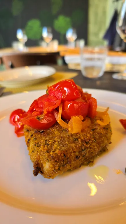 O quinto prato do menu escolhido foi o Spada alla palermitana. A receita com inspiração siciliana consiste em um filé de pesce spada (peixe-espada) empanado com farinha de rosca aromatizada com limão, salsa e peperoncino, acompanhada de tomates cereja assados com cebolas. Uma pedida leve para variar um pouco em relação aos pratos típicos do Piemonte.