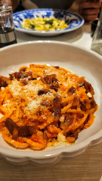 Receita tradicional do Lazio: massa curta servida com guanciale crocante, molho de tomate encorpado, pecorino e um leve toque de peperoncino. Um clássico romano feito no ponto certo, com sabores intensos mas equilibrados.