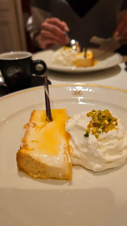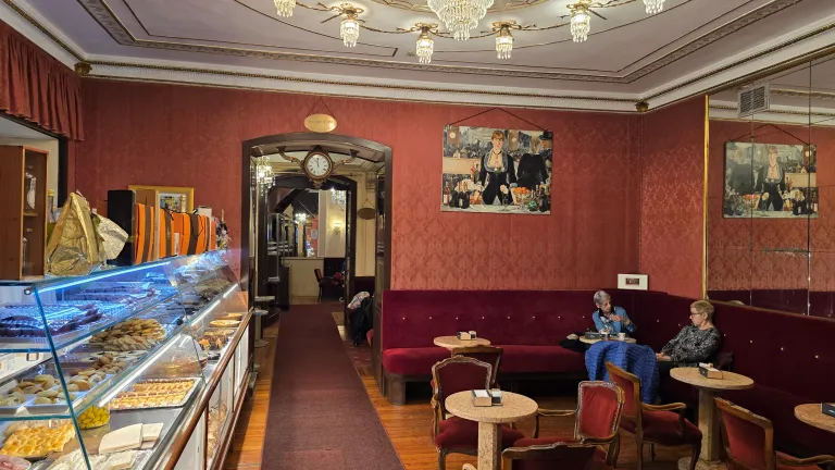 A fachada é fácil de reconhecer, com aquele letreiro dourado bonito que já convida a entrar. Dentro, o clima é de confeitaria antiga, com balcão de mármore claro e lustres enormes que dão um ar elegante, mas sem frescura. O salão tem um charme bem clássico: sofás de veludo vermelho, paredes forradas de tecido, espelhos grandes, quadros antigos e vitrines repletas de doces que são um convite ao olhar. Quando estivemos por lá, percebemos bem esse contraste: o serviço é mais formal, com garçons de colete, mas o ritmo lá dentro é super tranquilo — perfeito para sentar sem pressa e curtir o momento.