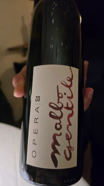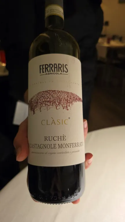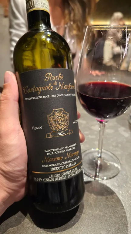 Para o último prato de carne, trocamos de vinho e fomos para o Ruchè di Castagnole Monferrato 2022 (Massimo Marengo), um tinto piemontês bem perfumado servido em taça — também sugestão da equipe da casa.