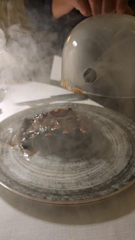 E o que dizer do Costine Ubriache, nossa escolha de prato entre as opções de Secondo Piatti (um para dividir, é claro). Uma incrível costela de porco cozida em baixa temperatura que vem desmanchando, soltando do osso, glaceada com vinho Lambrusco, defumada com ervas e servida sobre uma cama de batata rústica com alecrim. Até a apresentação impressiona: o prato vem servido sob uma cúpula, que quando retirada, libera a fumaça da defumação e uma mistura de aromas que abre o apetite independente de quanto você já tenha comido nos passos anteriores.