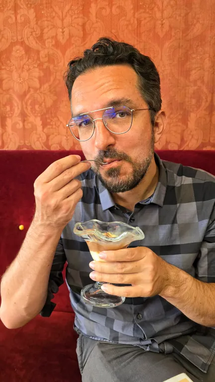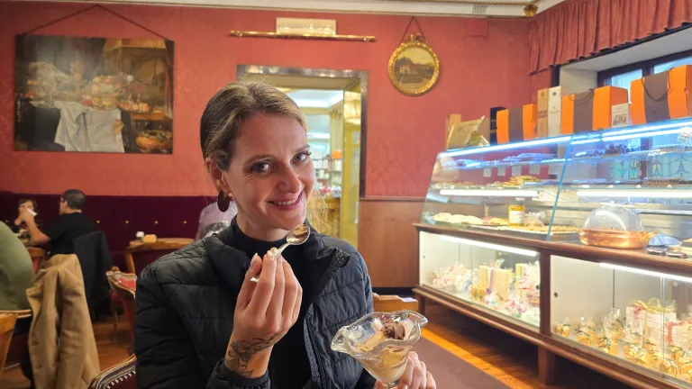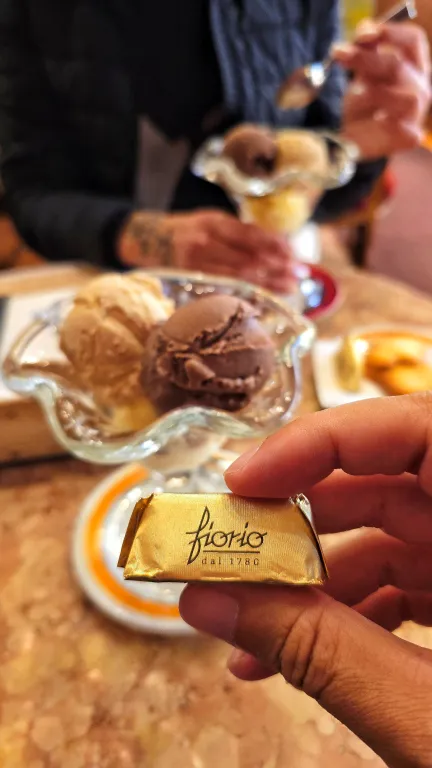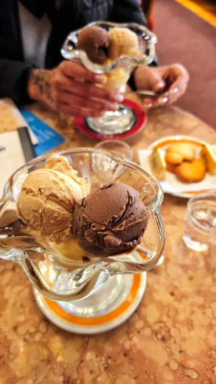 Como não poderia deixar de ser em um café clássico de Turim, o Bicerin é sempre uma boa opção de pedida: aquela combinação clássica de café espresso, chocolate quente espesso e creme de leite fresco, servida em uma bela taça transparente, em camadas. Mas na nossa parada não resistimos a uma outra especialidade do Fiorio (e de Turim): o gelato de gianduia, servido em taça, com sabor profundo de chocolate e avelãs que é puro Piemonte.