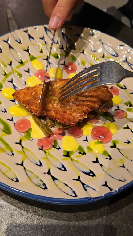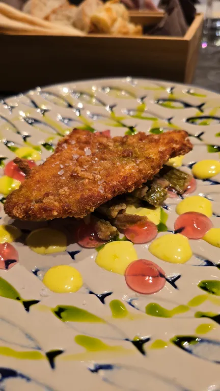 Após o drink de aperitivo, aceitamos a sugestão de uma taça do vinho branco “Piccolo Derthona” (Vigneti Massa, 2023), da uva italiana Timorasso, para harmonizar com os primeiros dois passos do menu degustação. Começamos pelo Branzino croccante e carpione — Robalo crocante servido no estilo “carpione” piemontês — leve marinada avinagrada com ervas que traz acidez e realça o frescor do peixe.