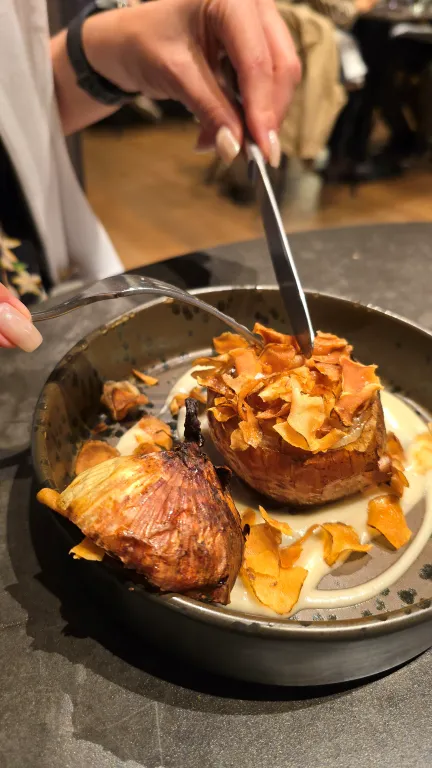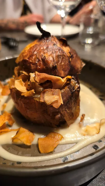 Na sequência, Cipolla arrosto ripiena di zucca mantovana — Cebola assada lentamente, recheada com purê cremoso de abóbora de Mantova. A apresentação é bem curiosa, onde temos literalmente uma cebola inteira assada com casca e tudo cortada ao meio. Aqui, as opiniões ficaram divididas, de acordo com o gosto pessoal de cada um em relação à cebolas. Quem é fã, certamente irá adorar a receita.
