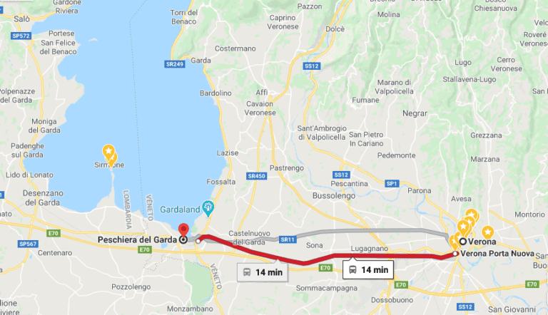 O trajeto de Verona até Peschiera Del Garda leva cerca de 15 minutos e a frequência de trens é bem alta, então não se preocupe se atrasar um pouco o seu café da manhã! Tanto para quem estiver hospedado em Verona (nosso caso) como em outras cidades do norte da Itália como Veneza, Milão ou Trento, uma viagem de 1 dia ao estilo bate-volta é perfeitamente viável.