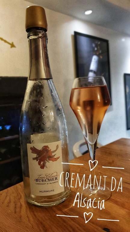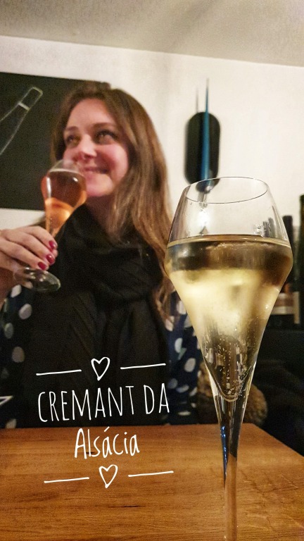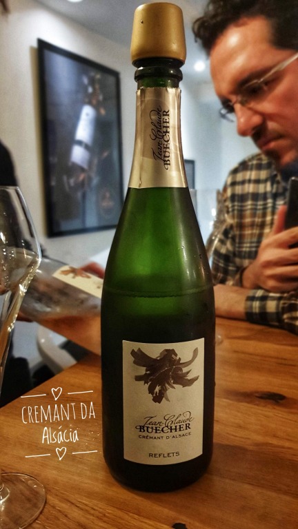 Começamos pelo aperitivo, degustando o Crémant D’Alsace – é o espumante típico da região, equivalente ao “champagne” da Alsácia. São feitos geralmente à partir da mistura de diversas variedades de uva (principalmente Pinot Blanc, Pinot Gris, Pinot Noir, Riesling e Chardonnay). Experimentamos o Crémant D’Alsace da vinícola Jean Claude Buecher nas versões blanc e rosé.