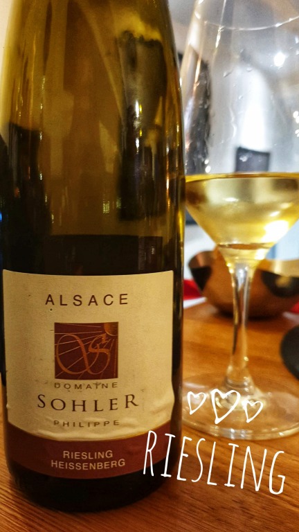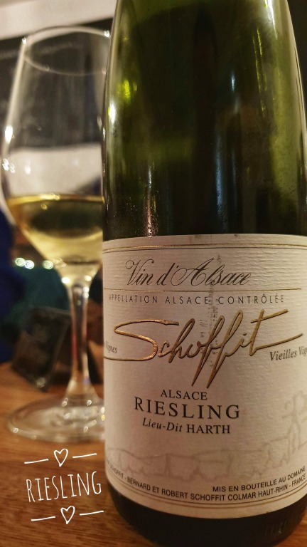 Na sequência, foram servidas duas taças de Riesling, vinho branco cuja uva é típica dessa região (Alsácia, Alemanha e Áustria). Essa variedade de uva produz vinhos brancos de ótima qualidade, com aromas finos, elegantes e intensos e de sabor fresco. Experimentamos o Alsace Riesling Lieu-Dit Harth da vinícola Schoffit (mais seco, ácido e frutado) e o Riesling Heissenberg da Domaine Philippe Sohler, um vinho de grande frescor.